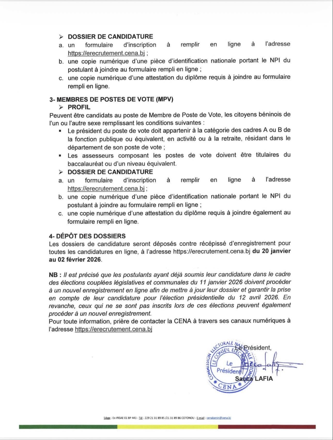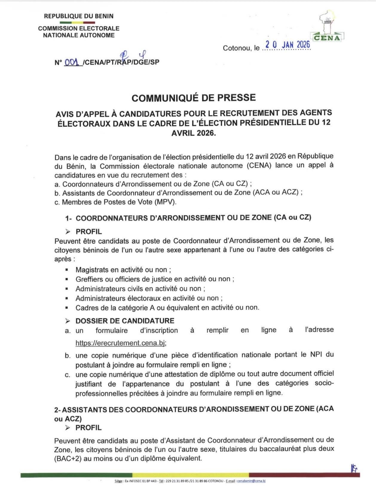 Présidentielles du 12 avril au Bénin : la CENA lance le recrutement des agents électoraux il y a 1 heure