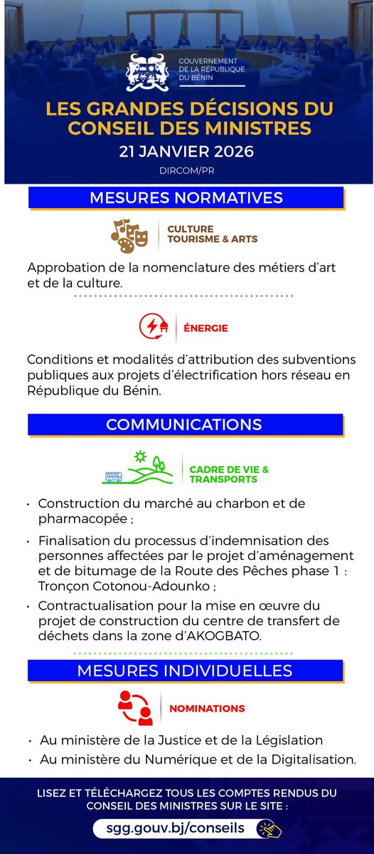 Au Bénin, le tout premier Conseil des Ministres de cette nouvelle année 2026 s’est réuni ce mercredi 21 janvier 2026, sous la présidence de Monsieur Patrice TALON, Président de la République, Chef de l’État, Chef du Gouvernement. En voici les grandes décisions