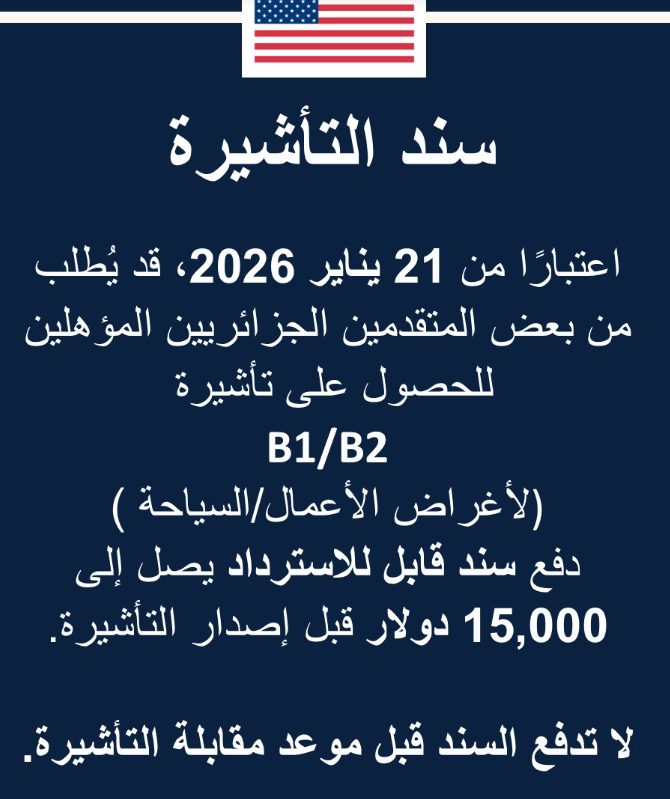 L’ambassade des États-Unis en Algérie a officialisé l’entrée en vigueur d’une nouvelle règle encadrant les demandes de visas B1/B2, destinés aux voyages de courte durée pour les affaires et le tourisme. Cette mesure impose, pour certains demandeurs algériens, le dépôt préalable d’une caution financière pouvant atteindre 15 000 dollars avant la délivrance du visa.