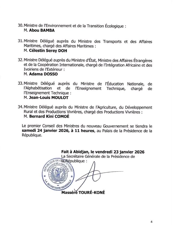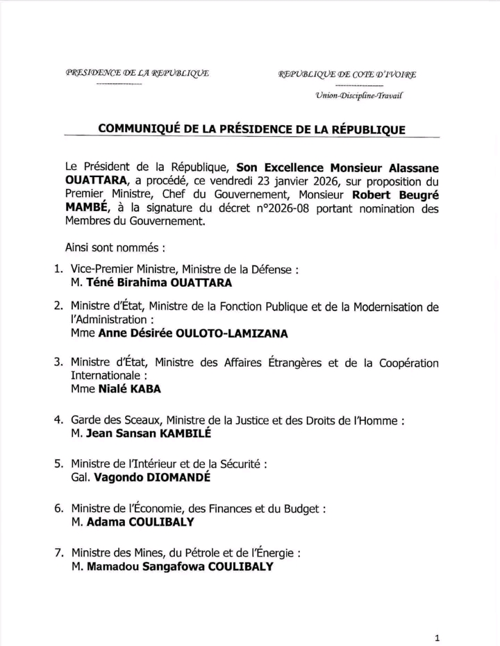 En Côte d’Ivoire, le Premier ministre Dr Robert Beugré Mambé, de commun accord avec le président de la République a procédé à la nomination d’un nouveau gouvernement ce vendredi 23 janvier 2026 dont voici la teneur.