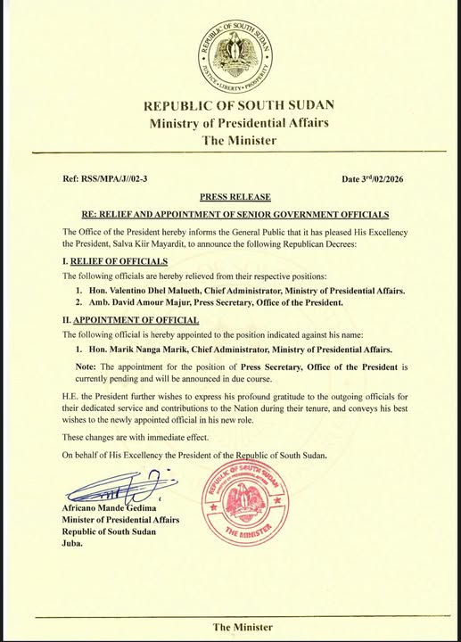Deux hauts fonctionnaires ont été relevés de leurs fonctions. Il s’agit de Hon. Valentino Dhel Malueth, Administrateur en chef au Ministère des Affaires Présidentielles, et d’Amb. David Amour Majur, Secrétaire de presse du Bureau du Président. Ces départs marquent la fin de leurs mandats, au terme desquels le Président a salué leur engagement et leurs contributions à la Nation.