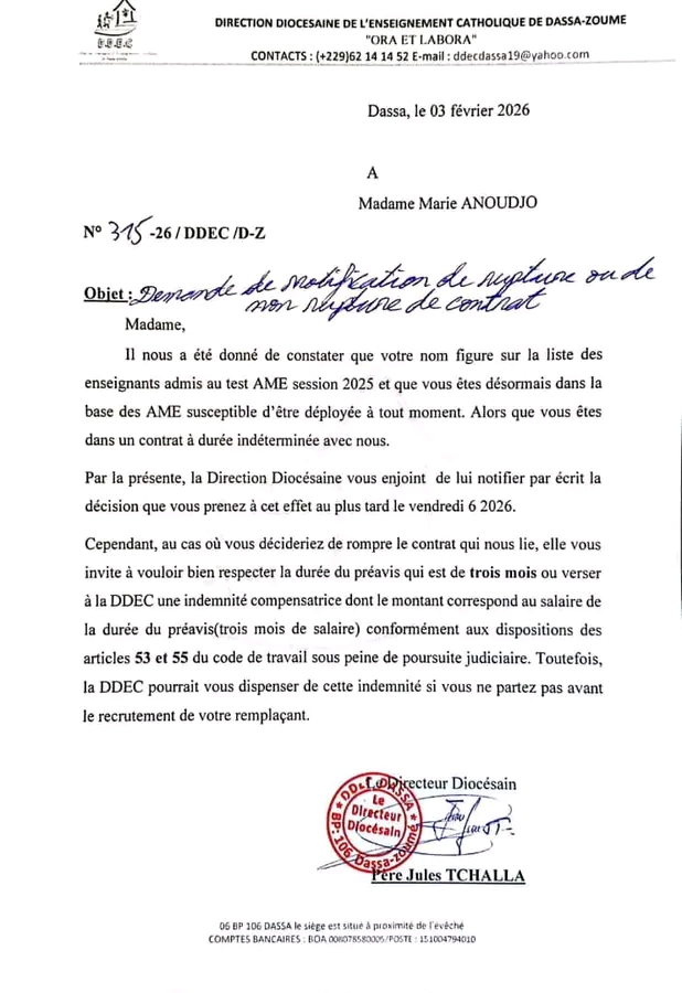En République du Bénin, la Direction diocésaine de l’enseignement catholique de Dassa-Zoumè met en demeure une enseignante sous contrat à durée indéterminée suite à son admission au test AME, session 2025. Dans un courrier officiel adressé à Madame M.A. l’administration catholique demande une notification écrite de sa décision, dans un délai précis, face à une situation jugée incompatible avec son engagement contractuel en cours.