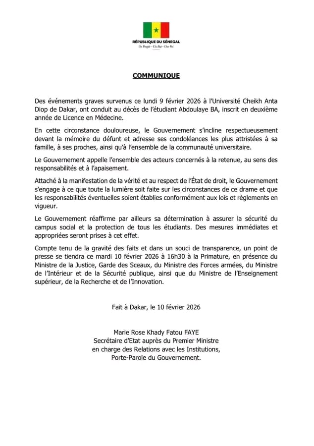 Le gouvernement sénégalais a exprimé sa profonde tristesse après la mort de Abdoulaye Ba, étudiant en deuxième année de médecine à l’Université Cheikh Anta Diop (UCAD) de Dakar, survenue lundi lors d’échauffourées liées à des revendications estudiantines.