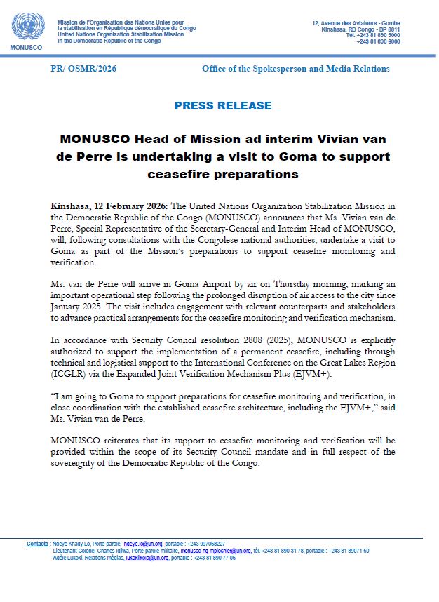 La MONUSCO a annoncé que Mme Vivian van de Perre, Représentante spéciale adjointe du Secrétaire général et cheffe de mission par intérim, effectue une visite à Goma afin de soutenir les préparatifs du mécanisme de surveillance et de vérification du cessez-le-feu.