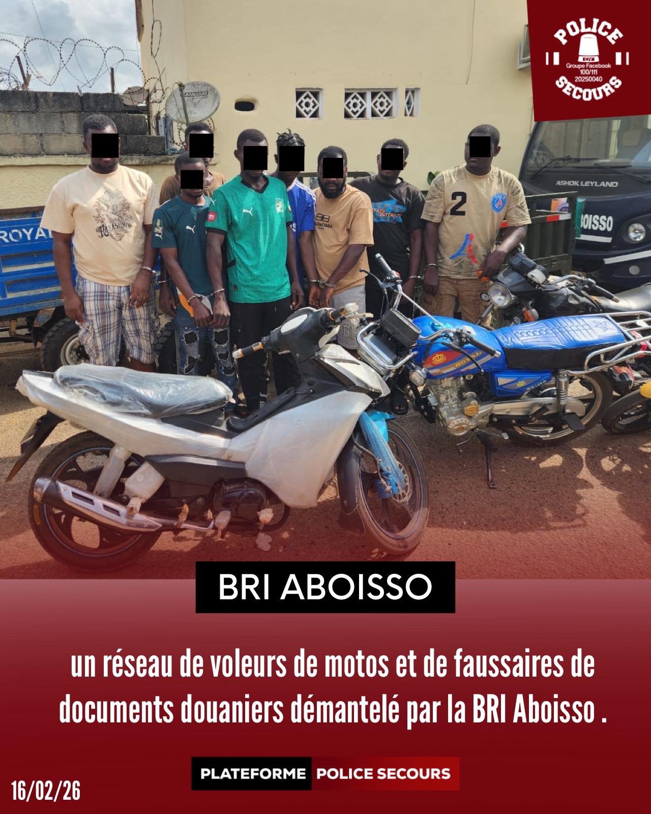 Dans la nuit du 12 au 13 février 2026, plusieurs habitants d’Aboisso ont constaté la disparition de leurs engins à deux et trois roues. Deux tricycles et deux motocyclettes avaient été dérobés. Saisie de l’affaire dans le cadre de l’opération « Épervier 11 », la Brigade de recherche et d’intervention (BRI) d’Aboisso a engagé des investigations approfondies : patrouilles renforcées, exploitation de renseignements et recoupement d’informations ont permis de suivre la trace des suspects.