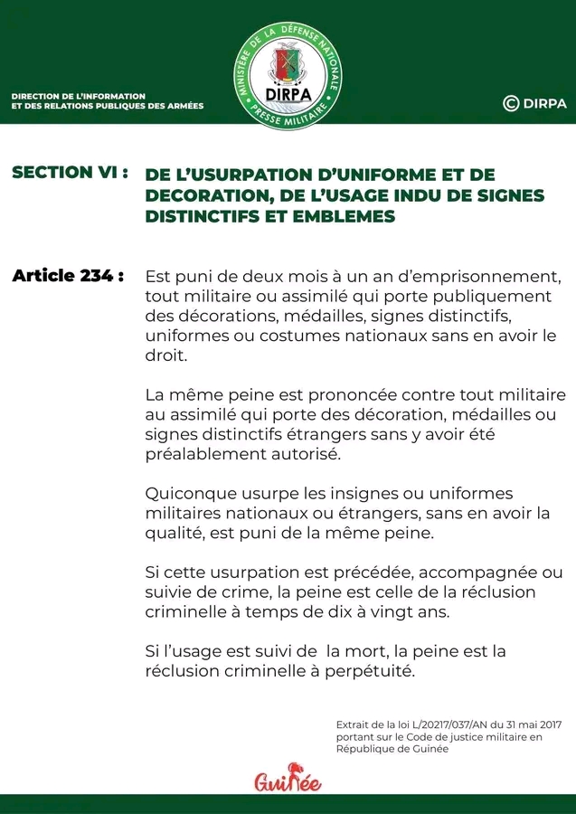 GUINÉE : RAPPEL DES ARTICLES 187 ET 234 PORTANT SUR L’USURPATION D’UNIFORME ET DE DÉCORATION, DE L’USAGE INDU DE SIGNES DISTINCTIFS ET EMBLÈMES