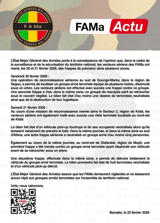 L’État-Major Général des Armées du Mali a annoncé que les Forces armées maliennes (FAMa) ont mené les 20 et 21 février 2026 plusieurs frappes de précision contre des groupes armés terroristes sur différentes zones du pays.