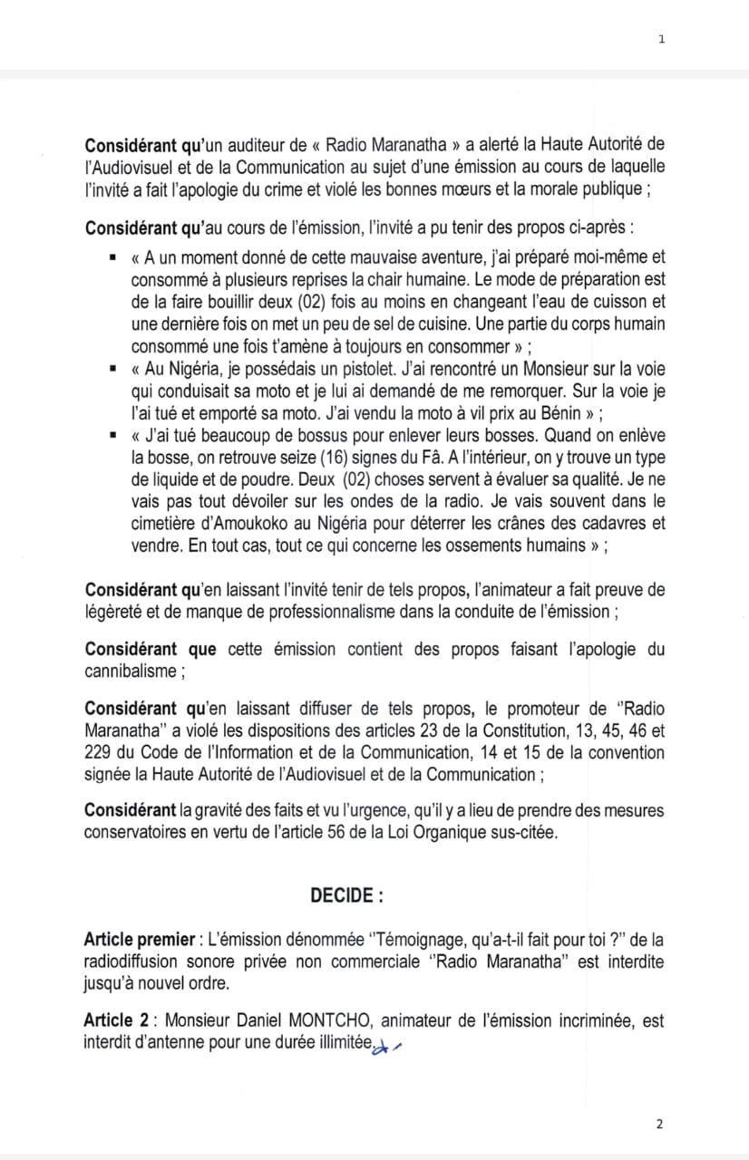Bénin – HAAC : une émission de Radio Maranatha suspendue pour apologie du cannibalisme