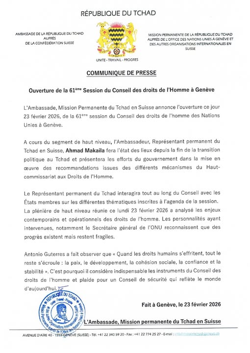 La Mission permanente de la République du Tchad en Suisse a annoncé l’ouverture, ce 23 février 2026 à Genève, de la 61e session du Conseil des droits de l’homme des Nations Unies. Cette rencontre internationale réunit les États membres autour des enjeux actuels liés à la protection des droits fondamentaux.