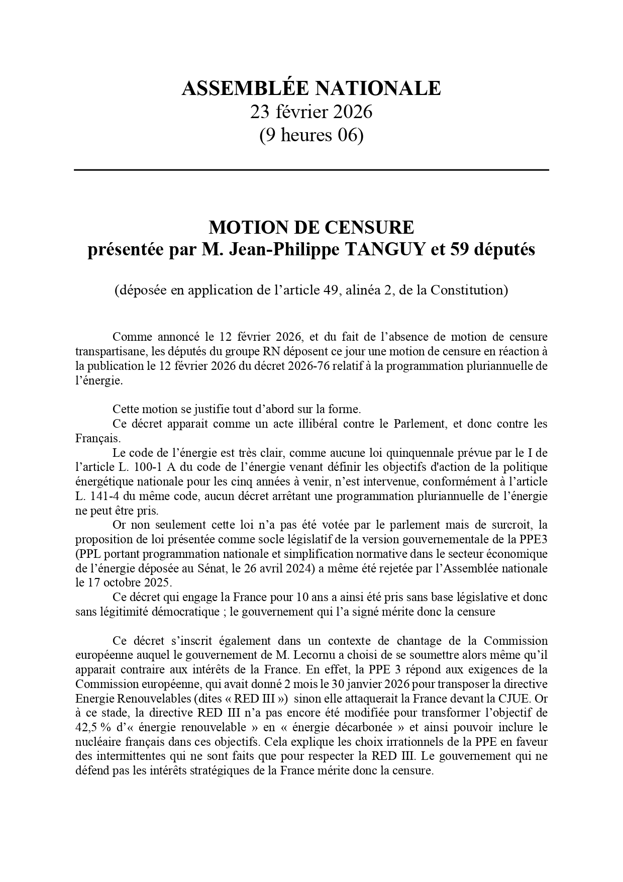 Une motion de censure a été déposée par Jean-Philippe Tanguy et 59 de ses collègues, conformément à l’article 49, alinéa 2, de la Constitution française.