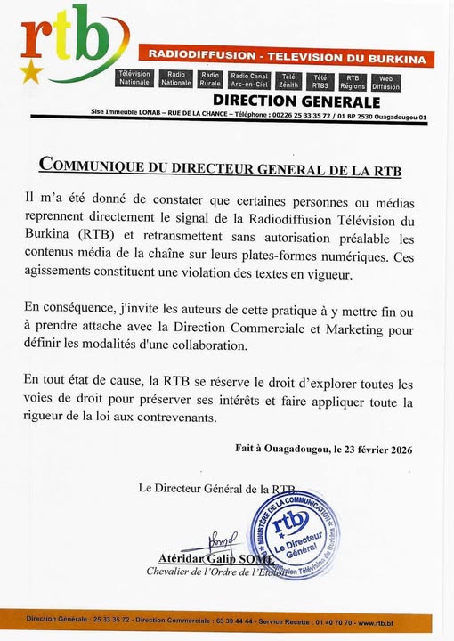 Le Radiodiffusion Télévision du Burkina (RTB), au détour d’un communiqué en date d’hier, lundi 23 février 2026, a rappelé que la reproduction et la diffusion de ses contenus sur des plateformes numériques sans autorisation constituent une violation de la loi.