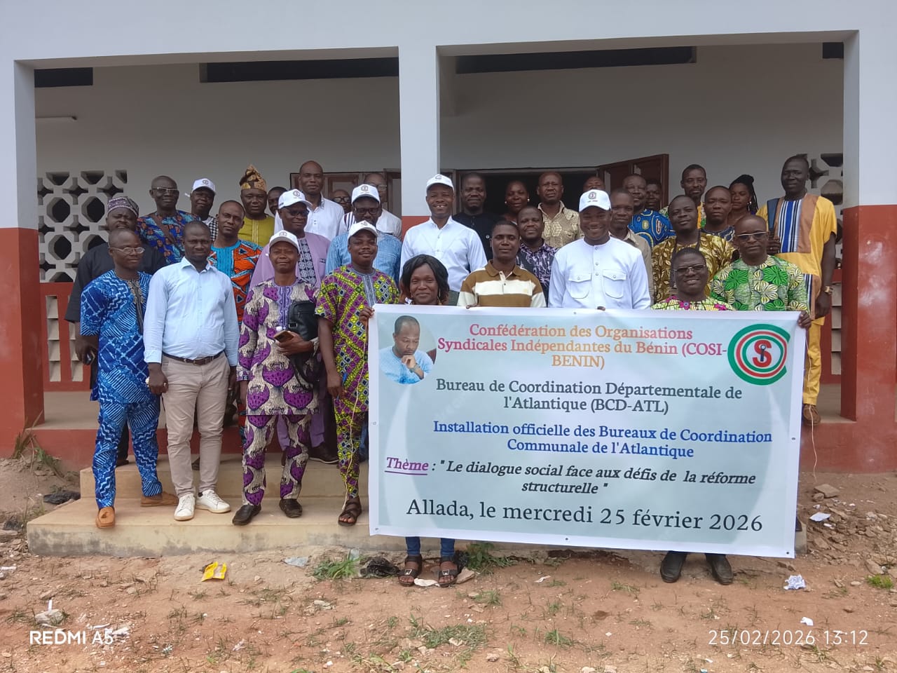 La Confédération des Organisations Syndicales Indépendantes du Bénin a procédé, ce mercredi 25 février 2026 à l’installation officielle des bureaux de coordination communale dans le département de l’Atlantique. La cérémonie s’est tenue à Allada sous la supervision du Secrétaire Général confédéral, Codjo Hinlin. Elle a été marquée par une communication inaugurale et par l’intervention du secrétaire départemental Atlantique, Romain Marc Dohou.