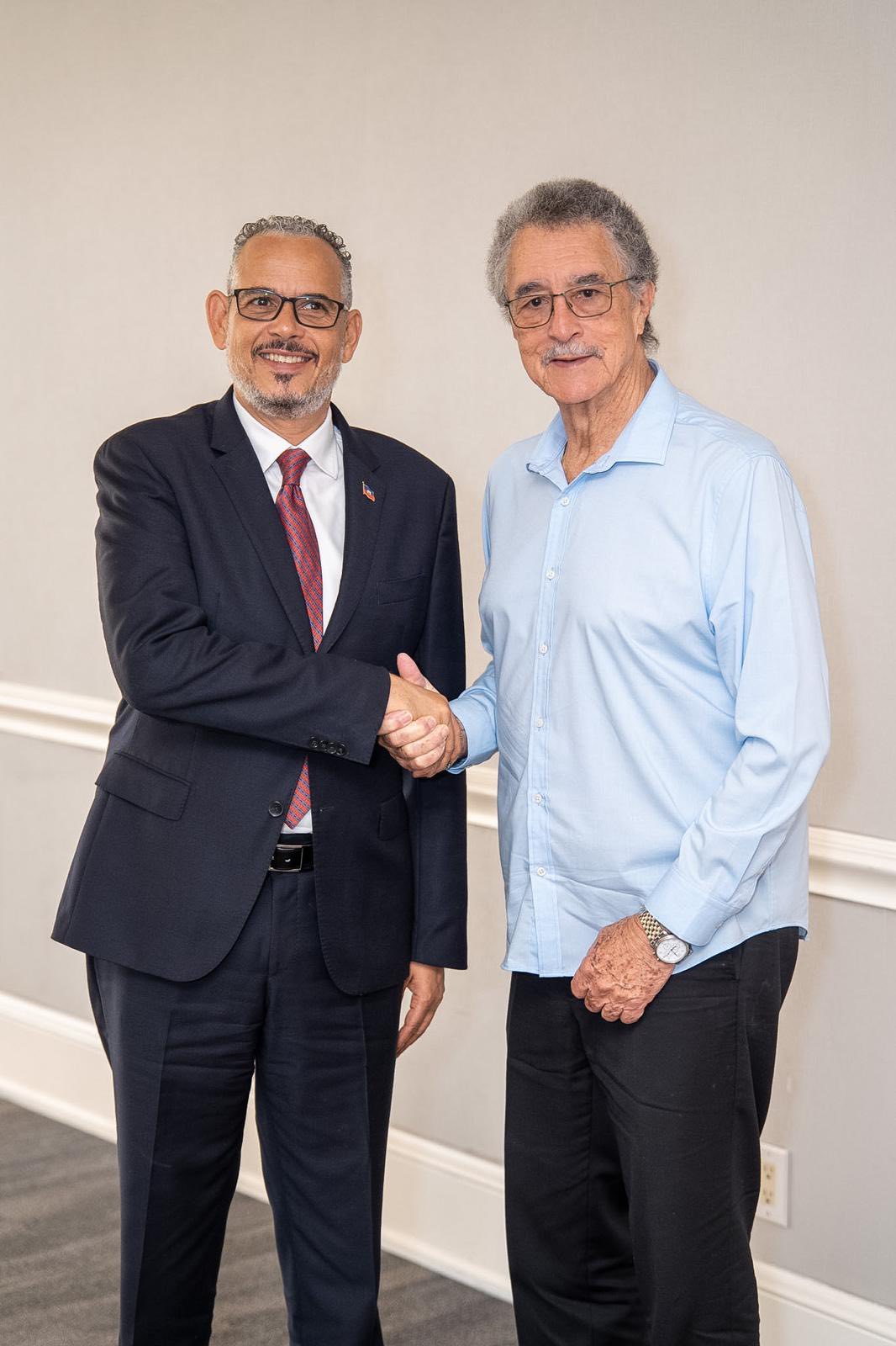 En marge de la 50ᵉ Réunion ordinaire de la Conférence des Chefs d’État et de Gouvernement de la CARICOM, le Premier ministre haïtien Alix Didier Fils-Aimé, accompagné de ses conseillers Guerly Lériche et Raina Forbin, a rencontré l’Éminente Personnalité de la CARICOM, Kenny Anthony.