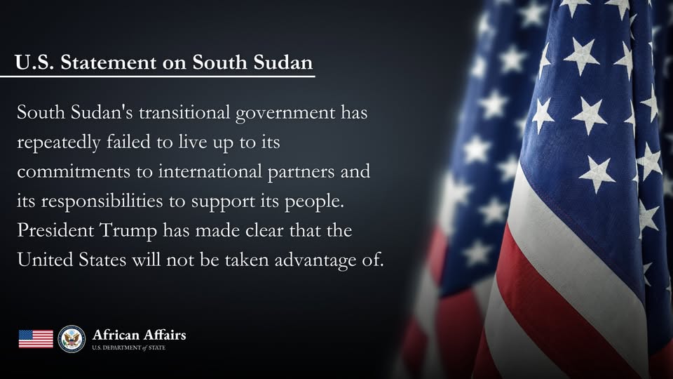 Le gouvernement américain a exprimé ses inquiétudes face aux manquements répétés du gouvernement de transition du Sud-Soudan à ses engagements internationaux et à sa responsabilité envers sa population. Dans une déclaration, Washington a souligné que le président Trump ne tolérerait pas que l’aide américaine soit exploitée et a précisé les mesures urgentes attendues :