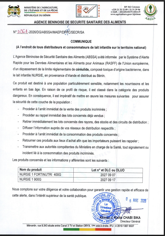 L’Agence Béninoise de Sécurité Sanitaire des Aliments (ABSSA) a lancé une alerte nationale concernant certains lots de lait infantile NURSIE importés d’Irlande. Selon l’ABSSA, ces produits présentent un dépassement de la limite réglementaire de céréulide, une toxine d’origine bactérienne, ce qui les classe parmi les produits dangereux pour les nourrissons et jeunes enfants.