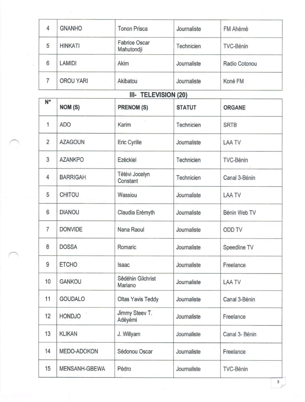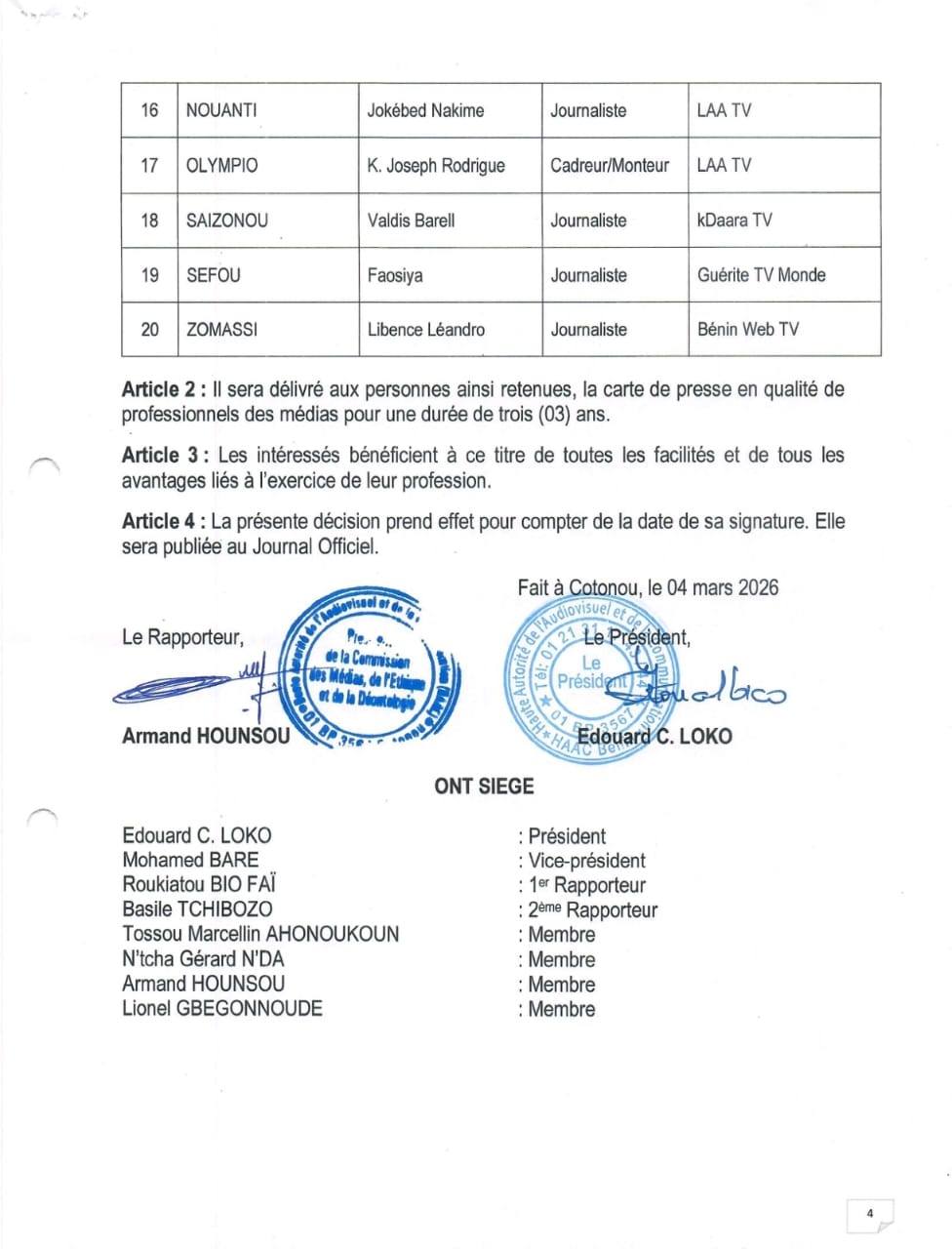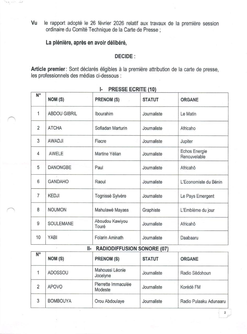 La Haute autorité de l’audiovisuel et de la communication (HAAC) du Bénin a publié, par la Décision n°26-006/HAAC du 04 mars 2026, la liste des trente-sept journalistes retenus pour bénéficier de la première attribution de la Carte de presse en République du Bénin.
