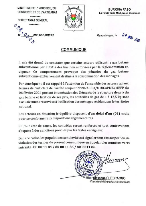 Le ministère de l’Industrie, du Commerce et de l’Artisanat du Burkina Faso alerte sur l’usage détourné du gaz butane subventionné par l’État. Ce gaz, destiné exclusivement aux ménages, est parfois utilisé à d’autres fins, provoquant des pénuries pour les familles. Conformément à l’article 3 de l’arrêté conjoint N°2024-003/MDICAPME/MEFP du 6 février 2024, les bouteilles de gaz de 1 à 12,5 kg doivent être strictement réservées aux ménages résidant sur le territoire national.
