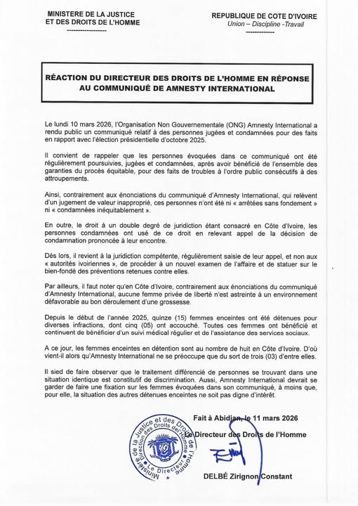 Ce mercredi 11 mars 2026, le Directeur des Droits de l’Homme de Côte d’Ivoire a répondu au communiqué publié par Amnesty International concernant des personnes jugées et condamnées pour des faits liés à l’élection présidentielle d’octobre 2025.