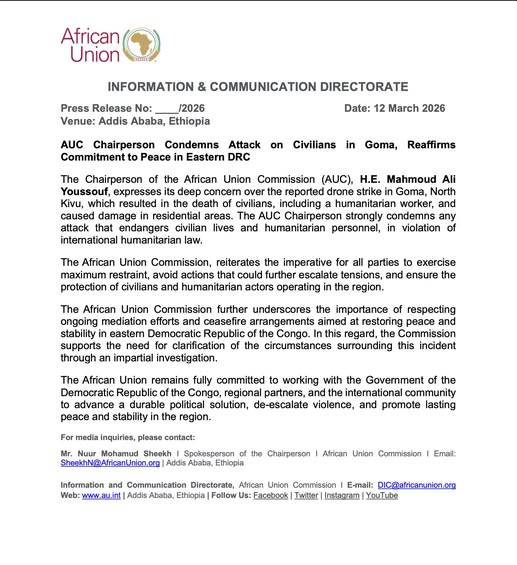 Le président de la Commission de l’Union africaine (AUC), Mahmoud Ali Youssouf, a exprimé, via un communiqué en date de ce douze mars 2026, sa vive préoccupation après l’attaque par drone survenue à Goma, dans le Nord-Kivu, qui a fait des victimes civiles, dont un travailleur humanitaire, et provoqué des dégâts dans des zones résidentielles. Il a fermement condamné toute attaque mettant en danger la vie des civils et du personnel humanitaire, en violation du droit international.