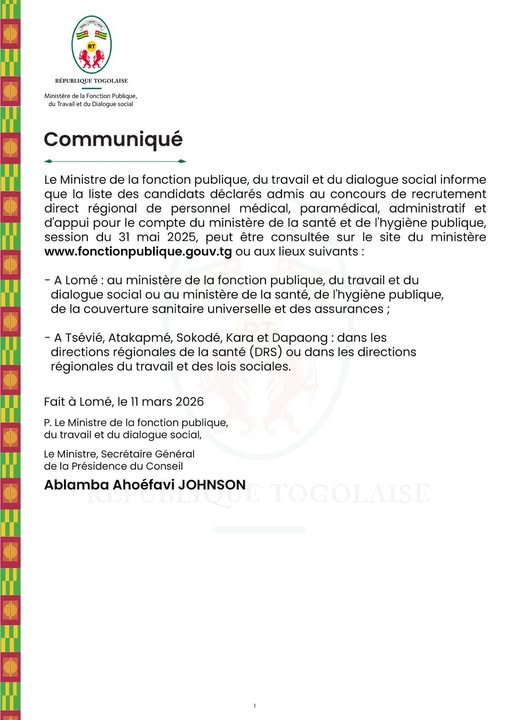 Le Ministre togolais de la Fonction publique, du Travail et du Dialogue social informe que la liste des candidats déclarés admis au concours de recrutement direct régional de personnel médical, paramédical, administratif et d’appui pour le compte du ministère de la Santé et de l’Hygiène publique, session du 31 mai 2025, est désormais disponible.
