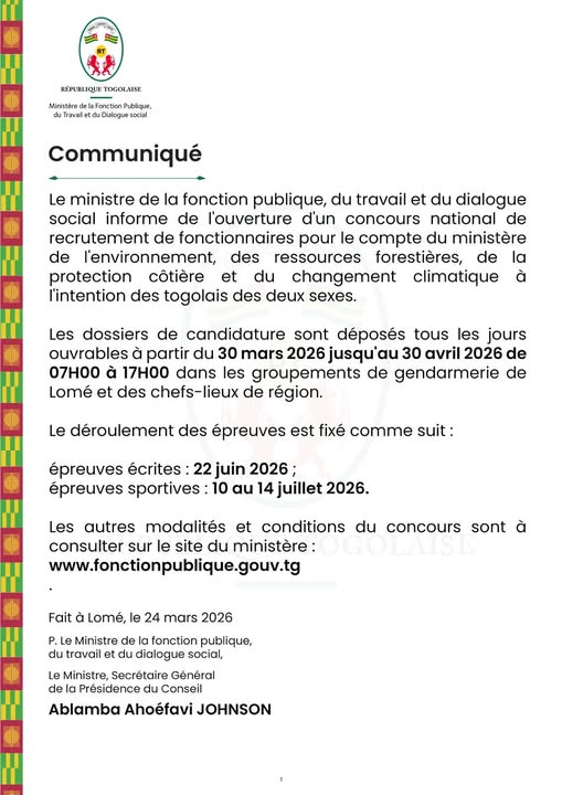 Le gouvernement togolais ouvre un concours national de recrutement de fonctionnaires au profit du ministère en charge de l’environnement, des ressources forestières, de la protection côtière et du changement climatique. L’annonce figure dans un communiqué publié hier, mardi 24 mars 2026 par Ablamba Ahoéfavi Johnson, ministre, secrétaire général de la Présidence du Conseil, agissant pour le compte du ministre de la Fonction publique.