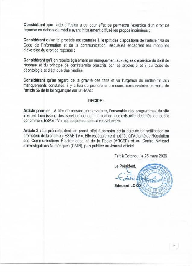 Au Bénin, la Haute autorité de l’audiovisuel et de la communication (HAAC) a décidé de suspendre, jusqu’à nouvel ordre et à titre conservatoire, l’ensemble des programmes de la chaîne de télévision et du site internet « ESAE TV ». Cette décision, prise pour des faits graves, concerne tous les services de communication audiovisuelle destinés au public fournis par cette entité.