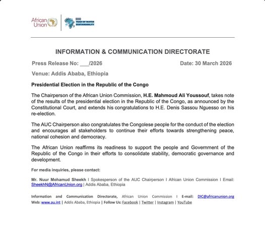 Dans un communiqué en date de ce lundi 30 mars 2026, la Commission de l’Union africaine a salué la réélection de Denis Sassou Nguesso à la tête de la République du Congo. L’institution continentale a pris acte des résultats proclamés par la Cour constitutionnelle et adressé ses félicitations au chef de l’État.