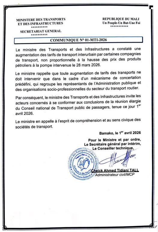 Le ministère des Transports et des Infrastructures du Mali a dénoncé une augmentation des tarifs du transport interurbain appliquée par certaines compagnies, jugée non proportionnelle à la récente hausse des prix des produits pétroliers intervenue le 28 mars 2026.