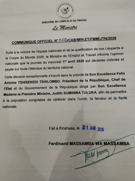 En RDC, le ministère de l’Emploi et du Travail a déclaré la journée du mercredi 1er avril 2026 chômée et payée sur toute l’étendue du territoire national. Cette décision intervient après la qualification de l’équipe nationale, les Léopards, pour la Coupe du monde 2026. Le gouvernement justifie cette mesure par la volonté de permettre à la population de célébrer cet exploit dans l’unité et la fierté nationale.
