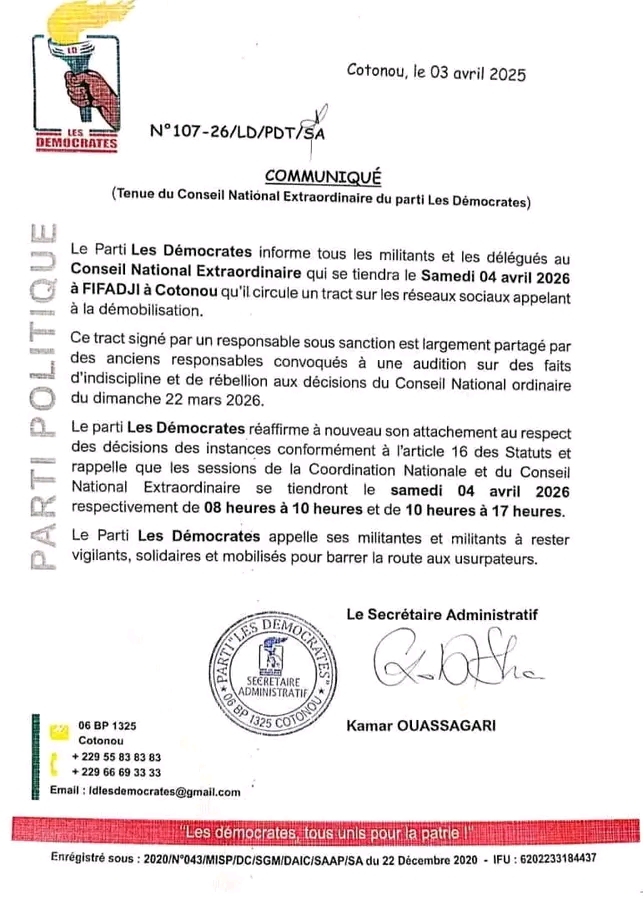 Dans son communiqué, le parti réaffirme son attachement au respect des décisions de ses organes, conformément à ses statuts. Il maintient la tenue des assises du samedi 04 avril 2026 et précise que la Coordination nationale se réunira de 08 heures à 10 heures, suivie du Conseil national extraordinaire de 10 heures à 17 heures.