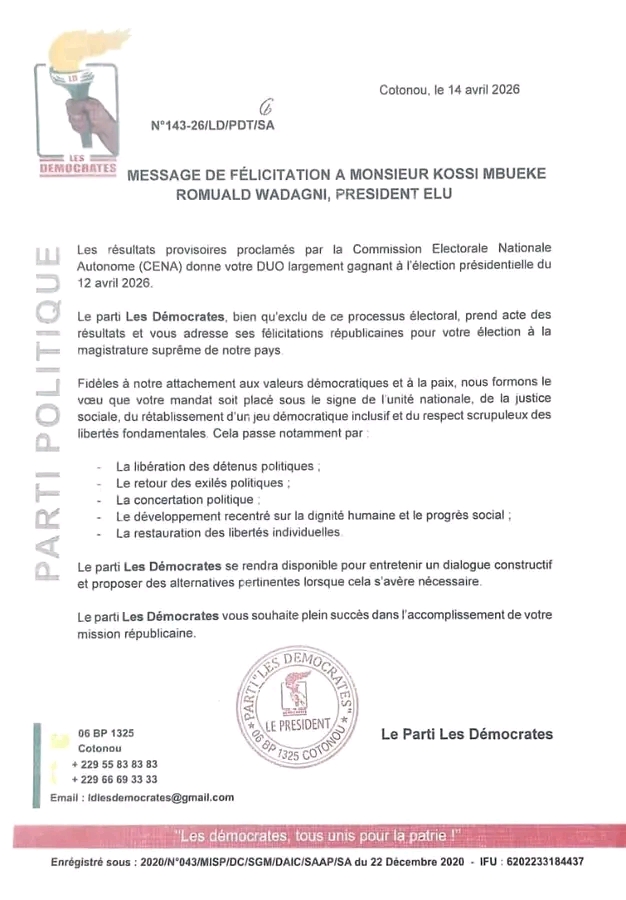 Présidentielle du dimanche 12 avril 2026 : le parti d’opposition Les Démocrates félicite le Président élu, Romuald Wadagni il y a 1 heure