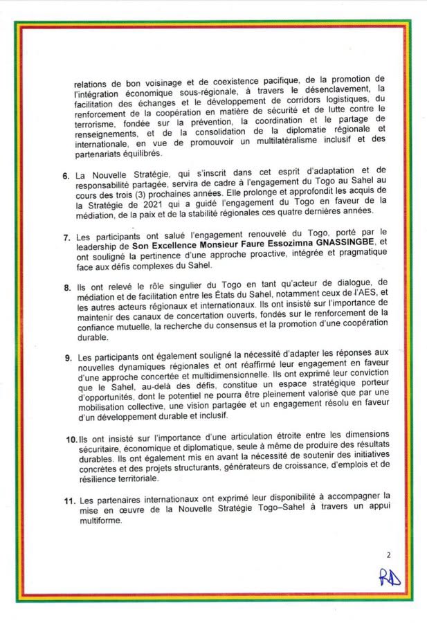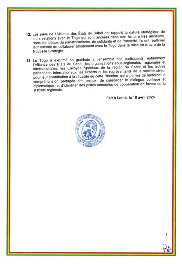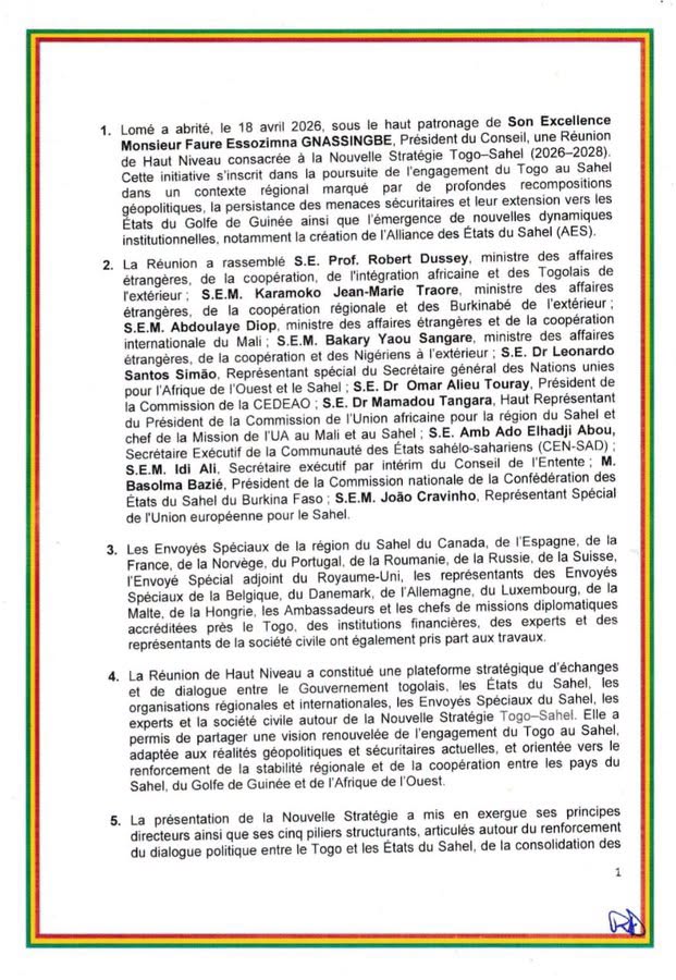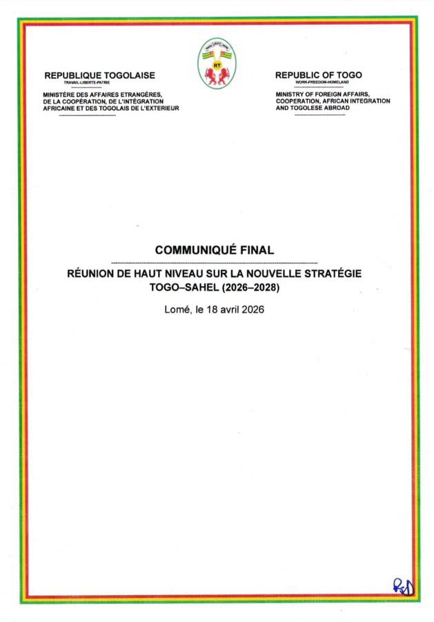 AccueilPolitique & SociétéCOMMUNIQUÉ FINAL DE LA RÉUNION DE HAUT NIVEAU SUR LA NOUVELLE STRATÉGIE TOGO-SAHEL (2026-2028) COMMUNIQUÉ FINAL DE LA RÉUNION DE HAUT NIVEAU SUR LA NOUVELLE STRATÉGIE TOGO-SAHEL (2026-2028) Kaweru Infosil y a 1 heureMoins d'1 min Tags:RÉUNION DE HAUT NIVEAU SUR LA NOUVELLE STRATÉGIE TOGO-SAHEL Shares: Article PrécédentSénégal : les douanes ont intercepté 6 milliards de faux billetsArticle suivantHong Kong (Chine) : des habitants retrouvent leur logement après l’incendie qui a fait 168 morts Dans la même catégorie Canada : plus de 20 000 personnes sous alerte d’évacuation en raison des feux de forêt Kaweru Infosil y a 8 mois République du Congo : la réélection de Denis Sassou Nguesso confirmée, validée et homologuée par la Cour constitutionnelle Kaweru Infosil y a 3 semaines Burkina Faso : le ministère de l’Industrie rappelle l’usage réservé du gaz butane subventionné aux ménages Kaweru Infosil y a 1 mois
