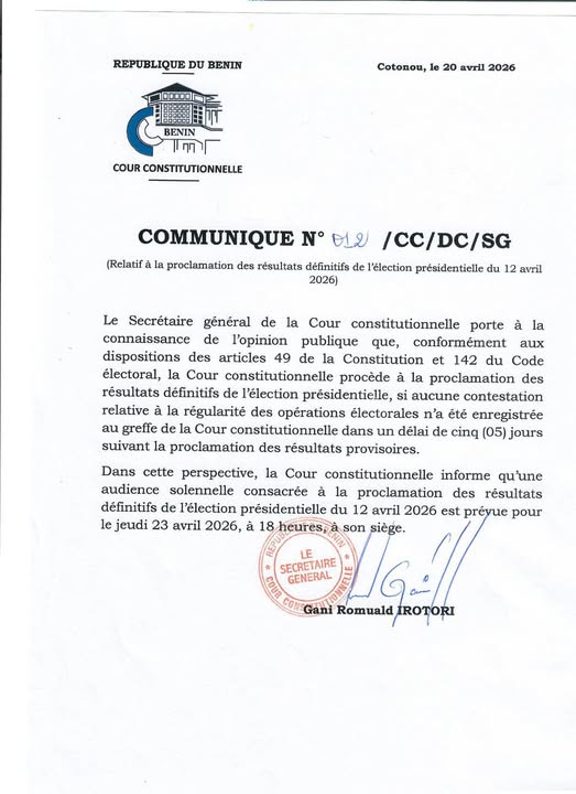 La Cour constitutionnelle du Bénin a annoncé la tenue d’une audience solennelle pour la proclamation des résultats définitifs de l’élection présidentielle du 12 avril 2026. L’annonce a été faite à Cotonou à travers un communiqué signé par le secrétaire général de l’institution. L’audience est prévue pour le jeudi 23 avril 2026 à 18 heures, au siège de la Cour. Selon le communiqué, cette étape intervient conformément aux dispositions de la Constitution et du Code électoral. Elle est prévue après la publication des résultats provisoires et en l’absence de contestation enregistrée dans les délais légaux.