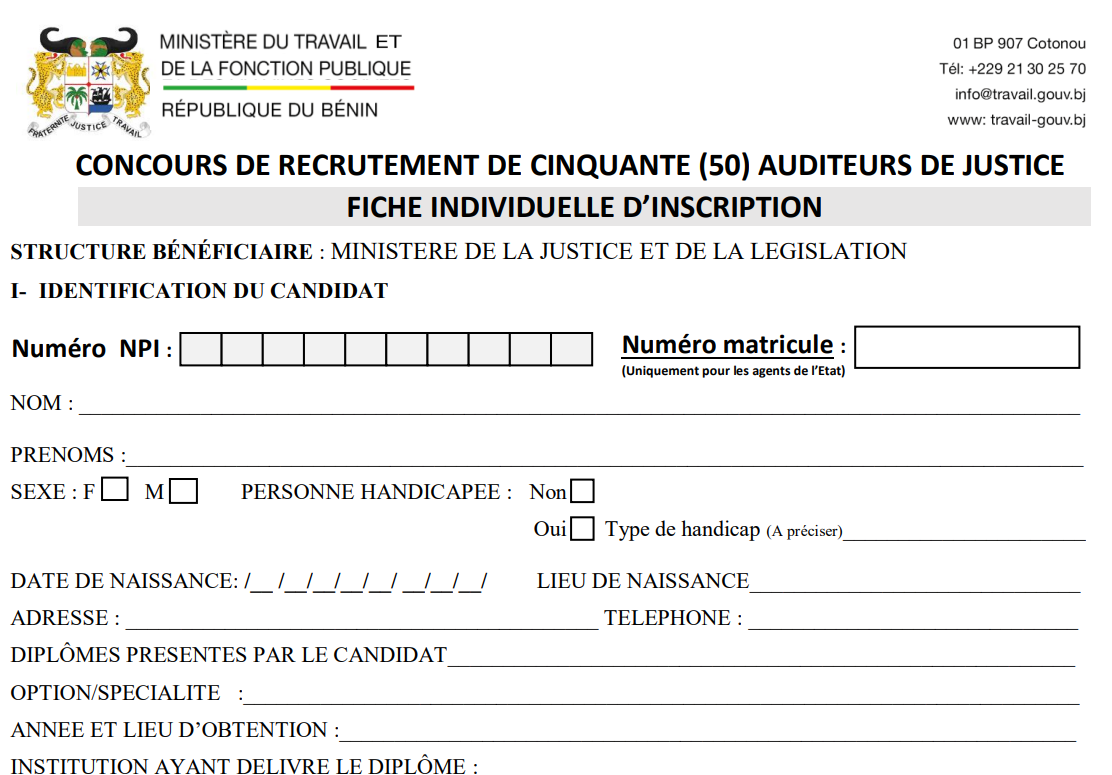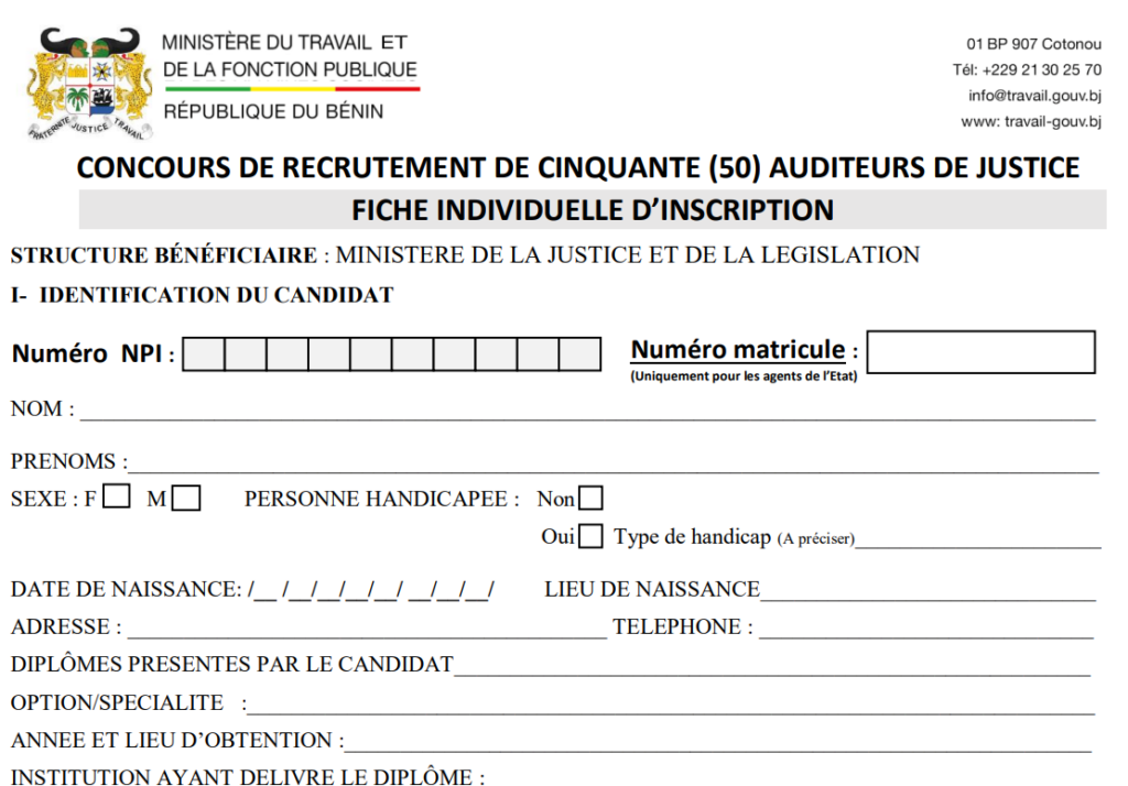 Le Ministère du Travail et de la Fonction publique du Bénin a annoncé l’ouverture d’un concours de recrutement au profit du secteur de la justice et de la législation. Selon le communiqué, 50 auditeurs de justice et 50 élèves greffiers seront recrutés dans le cadre de cette opération. Le processus prévoit également une prise en compte de l’inclusion, avec 2 postes réservés aux personnes en situation de handicap parmi les auditeurs de justice, et 3 parmi les élèves greffiers.