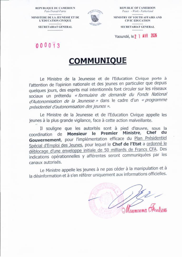 Au Cameroun, le ministère de la Jeunesse et de l’Éducation civique met en garde contre la circulation d’un faux formulaire en ligne lié au Fonds national d’autonomisation des jeunes. Dans un communiqué publié à Yaoundé, le ministre Mounouna Foutsou dénonce une tentative de manipulation diffusée sur les réseaux sociaux. Il appelle les jeunes à faire preuve de vigilance face à ce document non officiel.