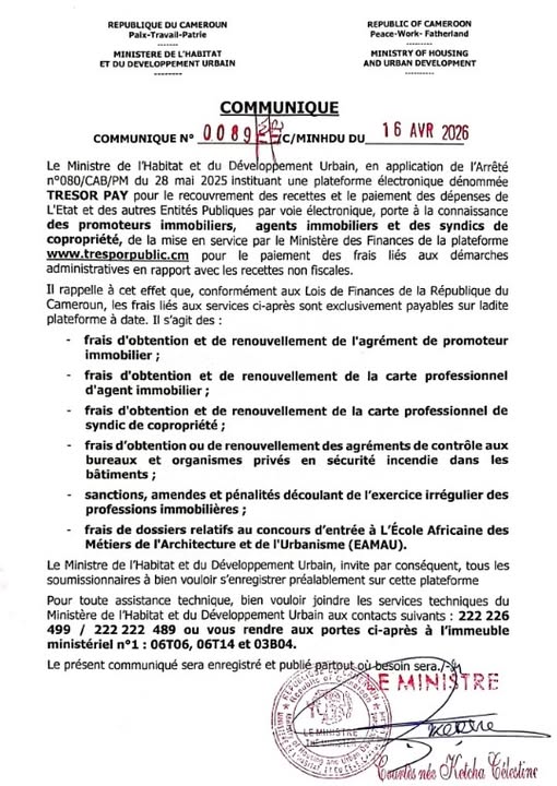 Au Cameroun, le ministère de l’Habitat et du Développement urbain impose désormais le paiement électronique pour plusieurs services liés au secteur immobilier. Dans un communiqué daté du 16 avril 2026, le ministre annonce la mise en service de la plateforme publique TRESOR PAY, accessible via le site du Trésor public. Ce dispositif, initié par le ministère des Finances, vise à moderniser la collecte des recettes de l’État.
