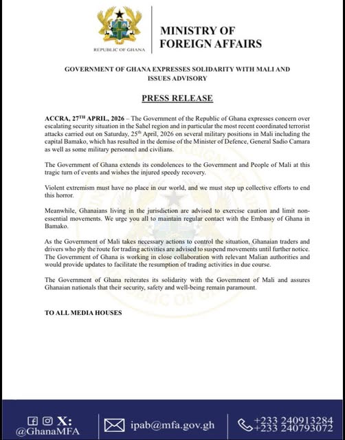 Le gouvernement du Ghana a exprimé sa vive préoccupation face à la dégradation de la situation sécuritaire dans la région du Sahel, à la suite d’attaques terroristes coordonnées survenues le 25 avril 2026 au Mali, notamment contre plusieurs positions militaires et dans la capitale Bamako. Dans un communiqué du ministère des Affaires étrangères, en date de ce lundi 27 avril, les autorités ghanéennes ont présenté leurs condoléances au gouvernement et au peuple maliens, ainsi qu’aux familles des victimes, tout en souhaitant un prompt rétablissement aux blessés.