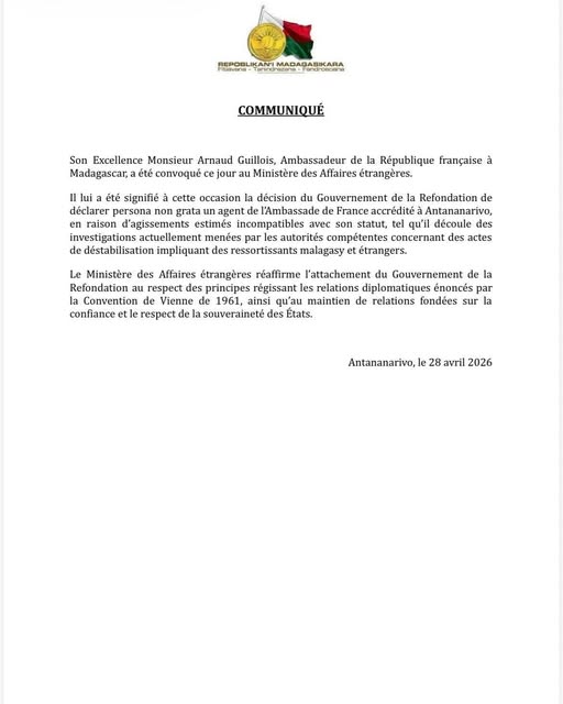 Le Gouvernement de la Refondation de la République de Madagascar a convoqué ce mardi 28 avril 2026 l’ambassadeur de France à Antananarivo, Arnaud Guillois, au ministère des Affaires étrangères. Au cours de cette rencontre, les autorités malgaches ont notifié la décision de déclarer persona non grata un agent de l’ambassade de France. Cette mesure est justifiée par des agissements jugés incompatibles avec son statut diplomatique, dans le cadre d’enquêtes en cours portant sur des faits présumés de déstabilisation impliquant des ressortissants malgaches et étrangers.
