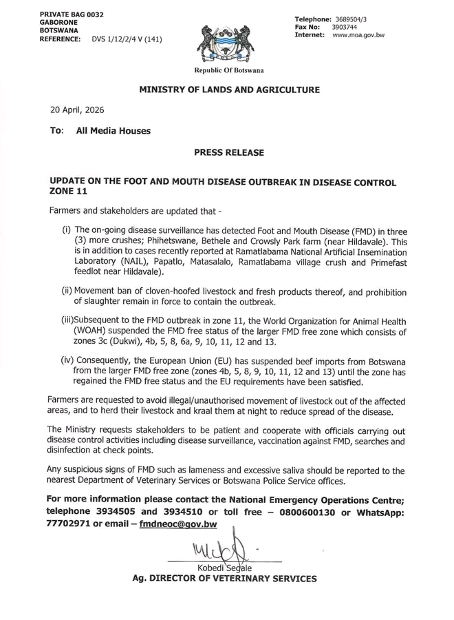 Le ministère des Terres et de l’Agriculture du Botswana a publié, ce lundi vingt avril, une mise à jour concernant l’évolution de l’épidémie de fièvre aphteuse dans la zone de contrôle des maladies 11. Selon le communiqué diffusé à Gaborone, la surveillance épidémiologique a permis de détecter de nouveaux foyers de la maladie dans trois centres de tri, notamment à Phihetswane, Bethele et à la ferme Crowsly Park, près d’Hildavale. Ces nouveaux cas viennent s’ajouter à ceux déjà signalés dans plusieurs autres localités, dont Ramatlabama et ses environs.