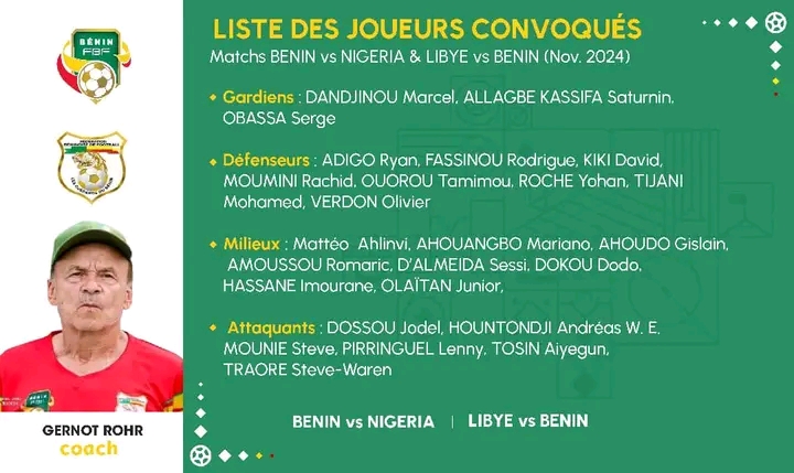 La liste de Gernot Rohr pour les 5è et 6è journées des éliminatoires de la CAN 2025. Dans cette liste, on note le retour de Serge Obassa, Lenny Pirringuel, Tosin Aiyegun et de Ryan Adigo.