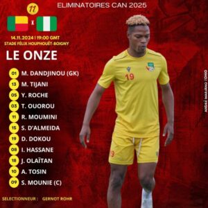 AccueilSport & CultureBénin vs Nigéria tout à l’heure à 20h : voici le 11 de départ de la sélection béninoise Bénin vs Nigéria tout à l’heure à 20h : voici le 11 de départ de la sélection béninoise Kaweru InfosIl y a 12 moisMoins d'1 min Dans le cadre de la 5e journée des eliminatoires de la Can 2025, le Benin reçoit, ce soir, en terre ivoirienne le géant de l’Est, le Nigéria. Voici le 11 entrant des Guépards. Mots-clés:11 entrantCan 2025Guépards Partage: Précédent5e J Eliminatoires CAN 2025 : défaite du Rwanda face à la Libye; un mince espoir pour les Guépards du BéninSuivantBénin 1 – Nigéria 0 à la pause : les Guépards du Bénin en bonne voie pour le Maroc Dans la même catégorie Ligue des Champions Féminine : l’AS FAR retrouve le TP Mazembe en finale Kaweru InfosIl y a 12 mois Premier League : Manchester City surclasse correctement Ipswich avant son choc contre le PSG Kaweru InfosIl y a 10 mois 3e J des éliminatoires Can 2025 : sans pitié, le Maroc écrase la République Centrafricaine Kaweru InfosIl y a 1 an Laisser un commentaire Laisser un commentaire Annuler la réponseVotre adresse e-mail ne sera pas publiée. Les champs obligatoires sont indiqués avec * Enregistrer mon nom, mon e-mail et mon site dans le navigateur pour mon prochain commentaire.