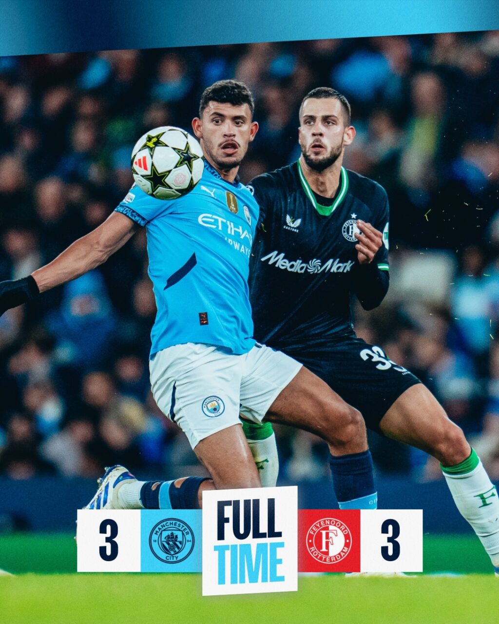 Un scénario complétement dingue. Alors que Manchester City menait 3-0, le champion d’Angleterre a été tenu en échec mardi par Feyenoord (3-3) à l’Etihad, lors de la 5e journée de la Ligue des champions. L’équipe de Josep Guardiola, qui restait sur une série de cinq défaites toutes compétitions confondues, a concédé trois buts dans le dernier quart d’heure.