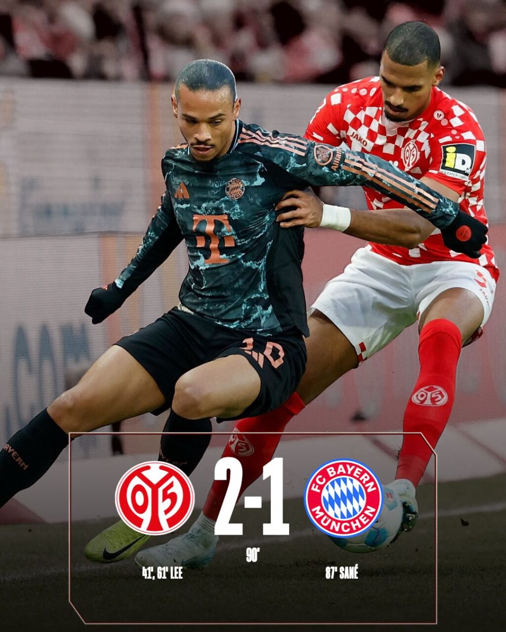 Le Bayern Munich a signé sa pire performance de la saison sous l’ère Kompany, s’inclinant 2-1 contre Mainz 05. Après une première mi-temps difficile, Mainz a pris l’avantage grâce à Jae-Sung Lee, qui a frappé à bout portant après un tir repoussé de Sieb. Peu après l’heure de jeu, Lee a doublé la mise avec un tir dévié qui laissait Neuer sans solution. Leroy Sané a réduit l’écart en fin de match, mais c’était trop tard pour éviter la première défaite du Bayern en championnat.