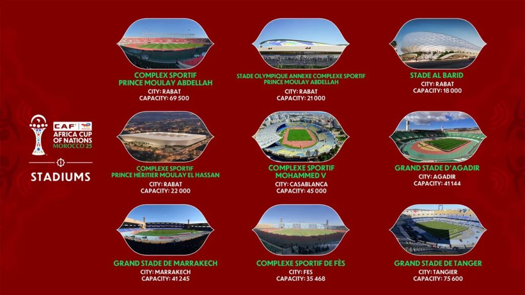 Six villes et neuf stades ont été retenus pour ce tournoi phare du football africain, qui se tiendra du 21 décembre 2025 au 18 janvier 2026. Il s’agit des villes de Rabat, Casablanca, Agadir, Marrakech, Fès et Tanger.