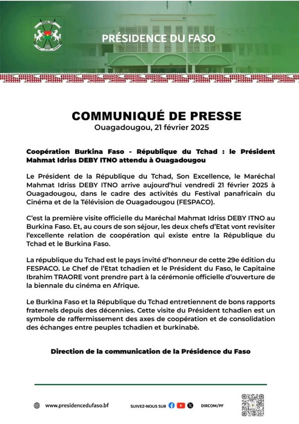 Le Président de la République du Tchad, Mahmat Idriss Déby Itno, est attendu aujourd’hui, vendredi 21 février 2025, à Ouagadougou dans le cadre du Festival panafricain du Cinéma et de la Télévision de Ouagadougou (FESPACO). Cette première visite officielle marque un moment fort dans les relations entre le Tchad et le Burkina Faso.