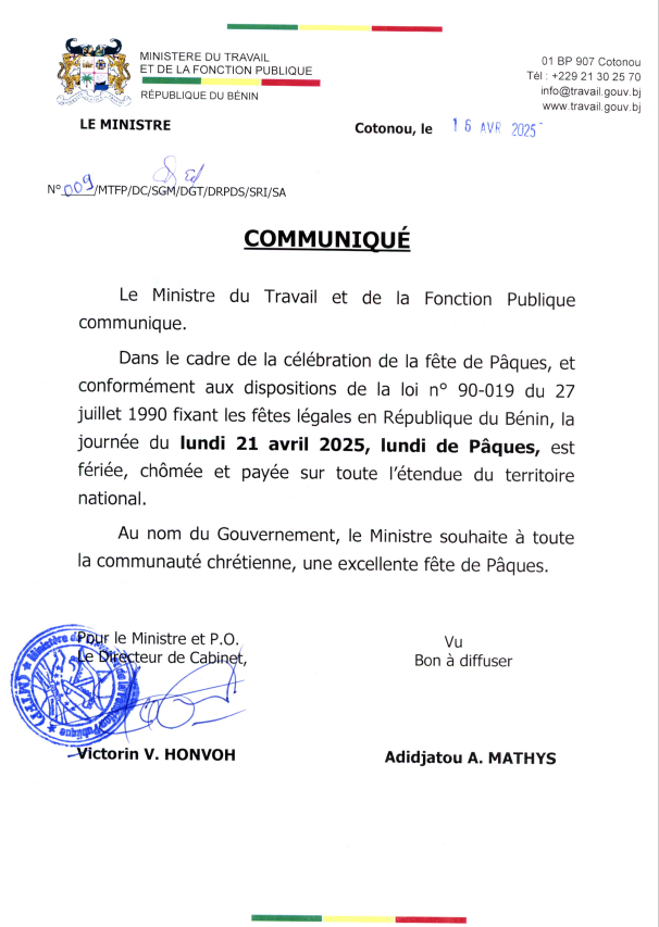AccueilSport & CultureBénin : le lundi 21 avril 2025 est férié, chômé et payé Bénin : le lundi 21 avril 2025 est férié, chômé et payé Kaweru InfosIl y a 7 moisMoins d'1 min Mots-clés:21 avrilBéninPâques Partage: PrécédentDécès du footballeur Aaron Boupendza en Chine : l’enquête confirme que l’incident résulte d’une chute accidentelle depuis le 11ᵉ étage de son immeubleSuivantBénin : avis d’appel à candidatures pour le recrutement d’un Directeur du Volet Formation du Projet ARCH Dans la même catégorie C1 : Olise et Kane propulsent le Bayern vers une légère avance, contre le Celtic Kaweru InfosIl y a 9 mois Padel : l’Espagne triomphe au FIP Silver-Nhood Open d’Abidjan Kaweru InfosIl y a 4 semaines Sport : la Bundesliga soutient le développement du football vietnamien Kaweru InfosIl y a 8 mois Laisser un commentaire Laisser un commentaire Annuler la réponseVotre adresse e-mail ne sera pas publiée. Les champs obligatoires sont indiqués avec * Enregistrer mon nom, mon e-mail et mon site dans le navigateur pour mon prochain commentaire.