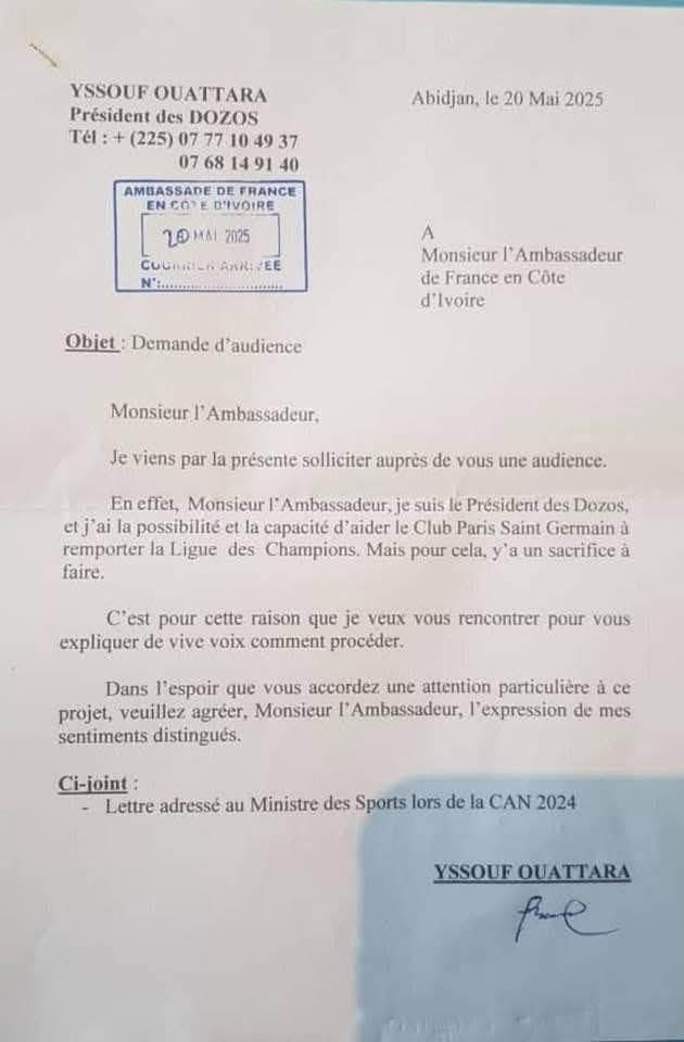 Dans ce courrier, Yssouf Ouattara, président du groupe, sollicite un entretien avec l’ambassadeur afin d’apporter leur « contribution spirituelle » pour aider le club parisien à décrocher le trophée. En Côte d’Ivoire, ces chasseurs sont respectés pour leur lien supposé avec le monde invisible, et leur démarche est prise au sérieux par beaucoup.