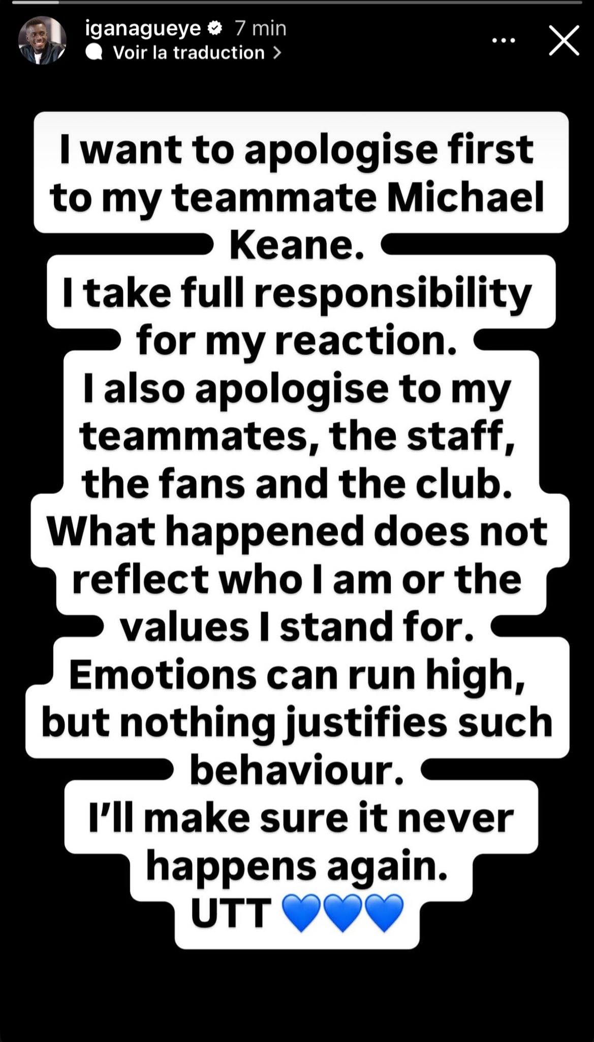 Malgré sa mise à l’écart, Everton a finalement remporté le match à dix, un soulagement pour Gueye. Sur Instagram, il assume pleinement sa responsabilité : « Je tiens à présenter mes excuses à Michael Keane. J’assume l’entière responsabilité de ma réaction », a-t-il écrit.
