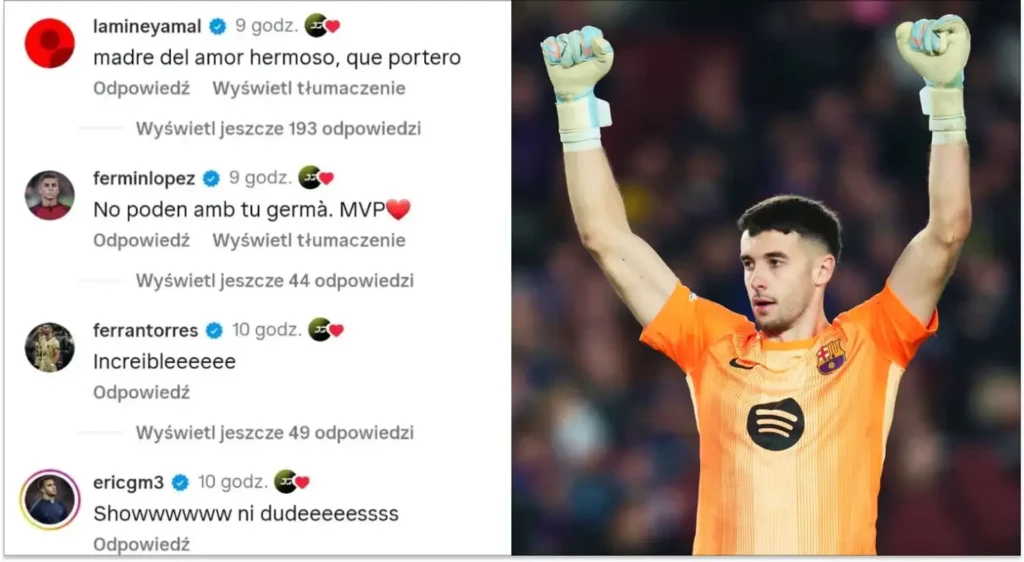 Lamine Yamal s’extasie : « Oh là là, quel gardien ! », tandis que Fermín López affirme : « Personne ne peut t’arrêter, mon frère ! ». Ferran Torres, Eric Garcia, Dani Olmo et Alejandro Balde ont également salué sa performance, mettant en avant son calme et sa maîtrise dans les buts.