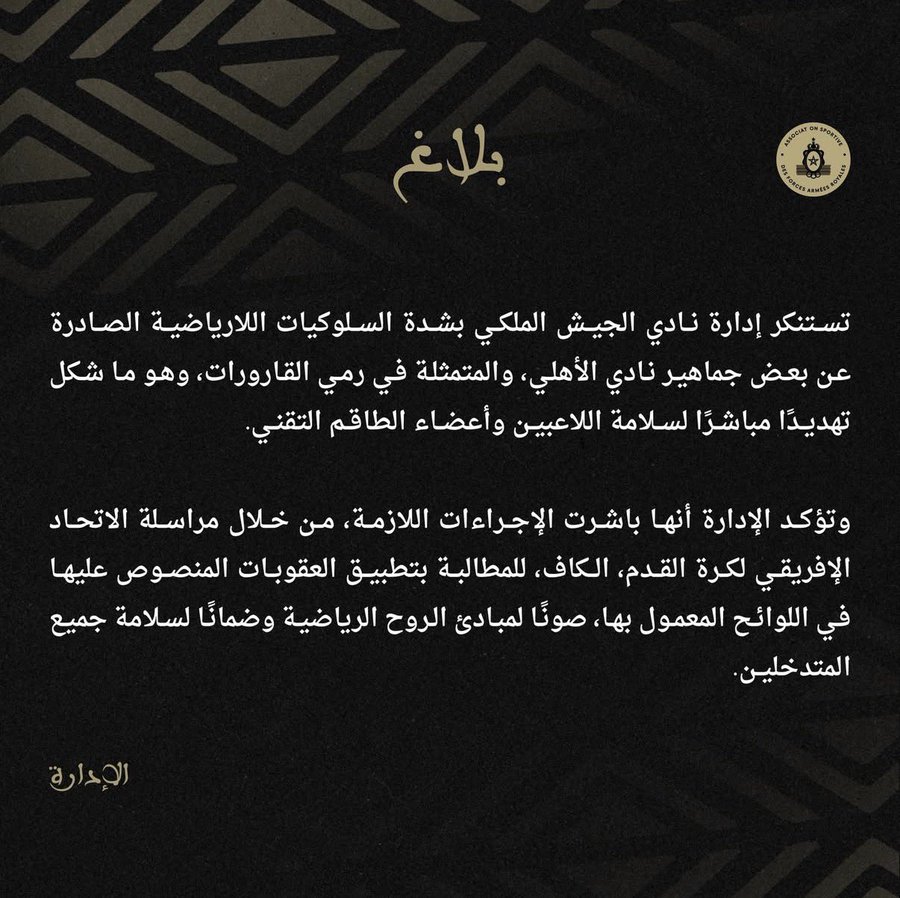Le club marocain a dénoncé des comportements antisportifs, notamment des jets de bouteilles, mettant en danger joueurs et staff technique, et a demandé l’application des sanctions prévues par le règlement de la CAF.
